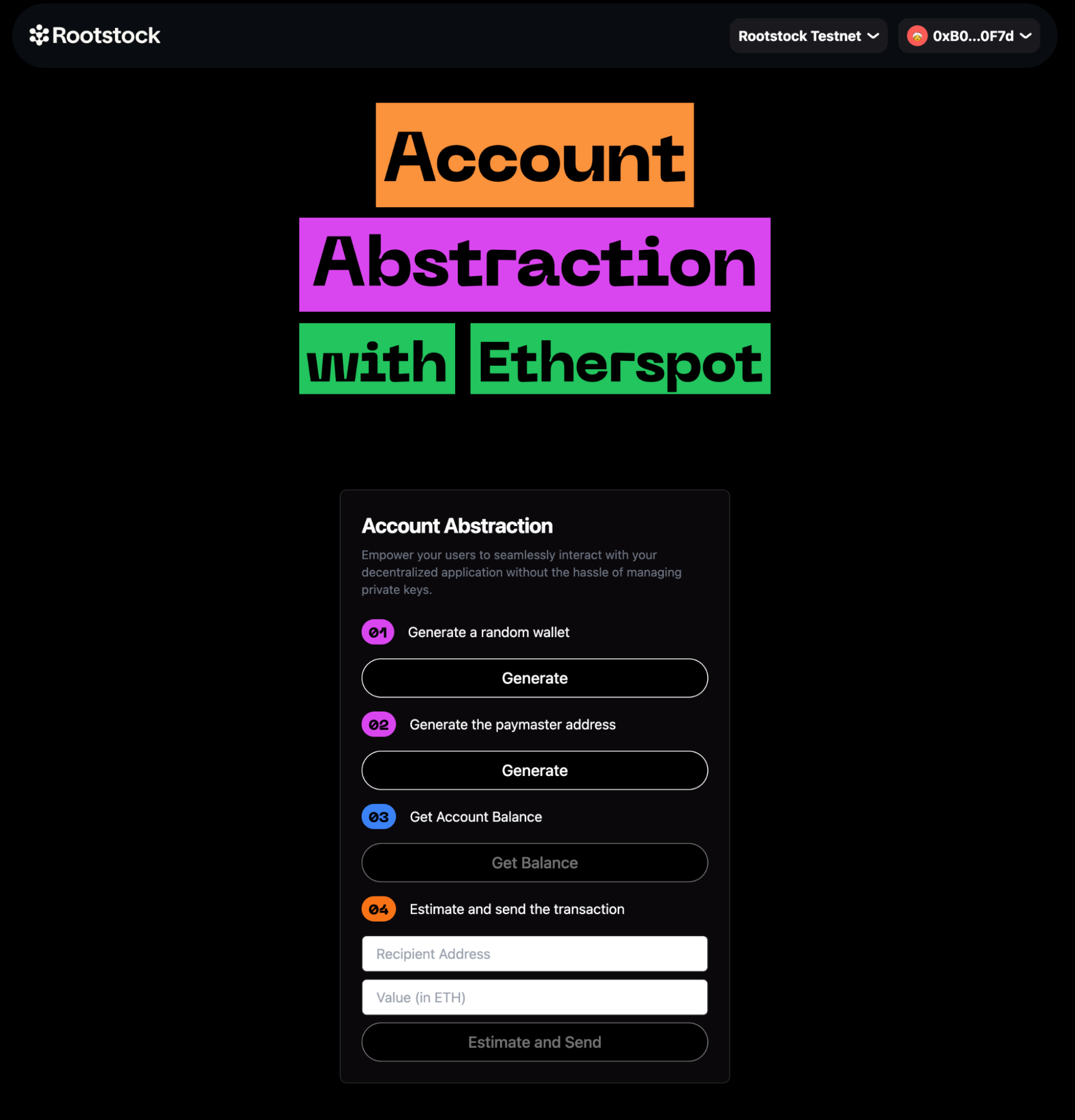 In this guide, you will learn how to use the Etherspot Prime SDK to deploy an Account Abstraction dApp on the Rootstock network. By following these steps, you'll empower your users to interact with your dApp without managing private keys directly.